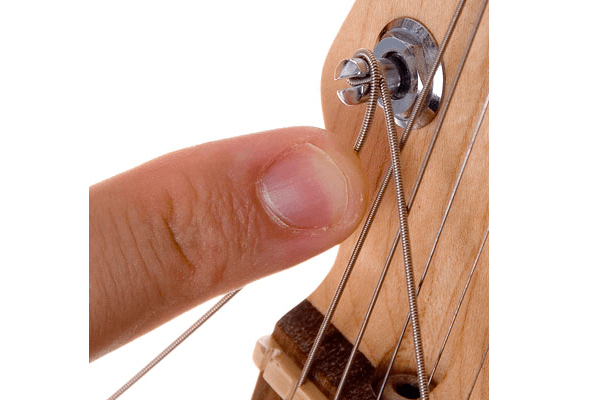 + Xoay tuner để tạo góc vuông với cần đàn. Kéo dây qua các lỗ điều chỉnh độ căng chuẩn cho dây đàn. Bạn về cơ bản tạo ra một vòng lặp với sự kết thúc của chuỗi xung quanh phần còn lại tạo độ chắc chắn.